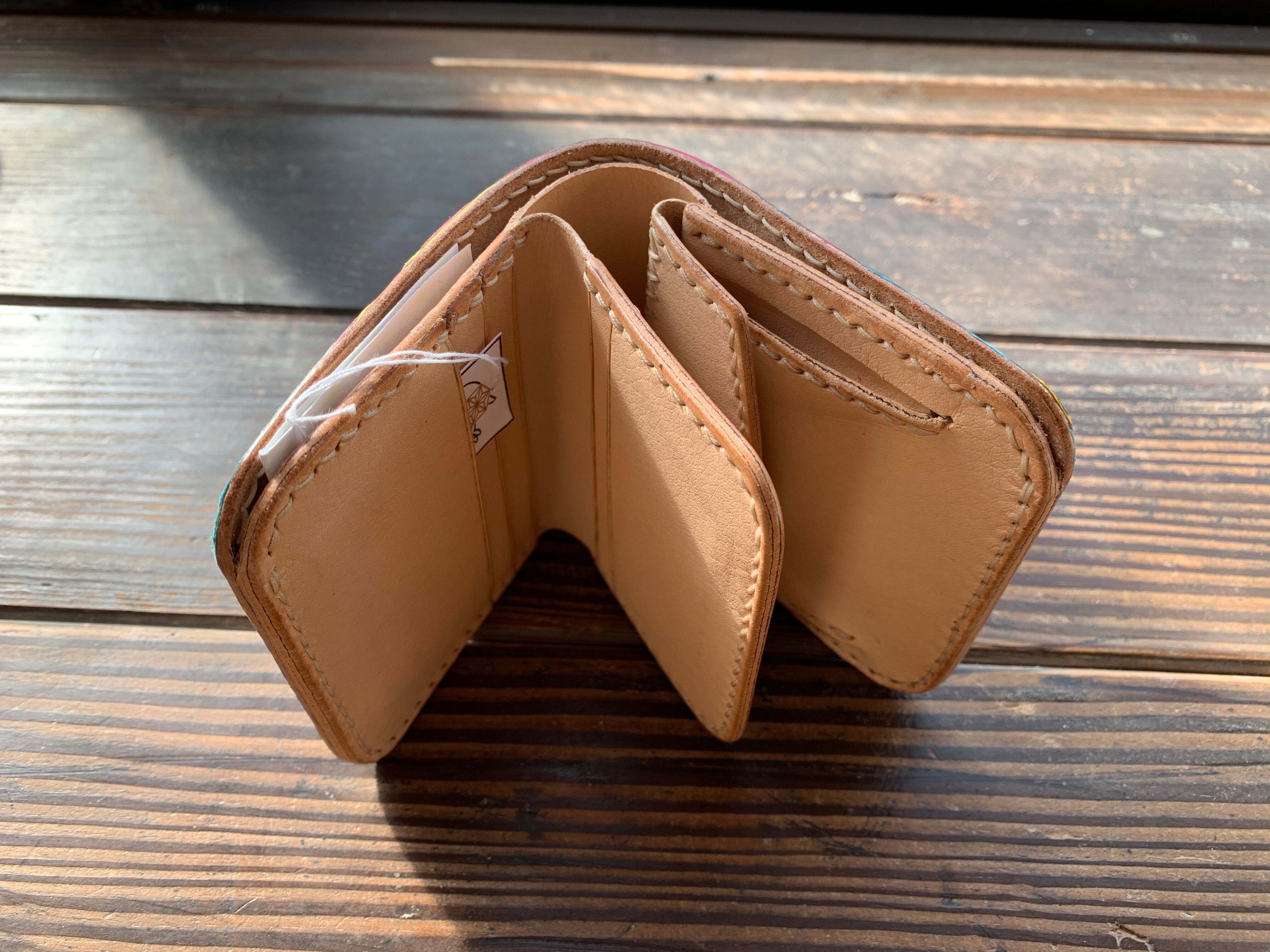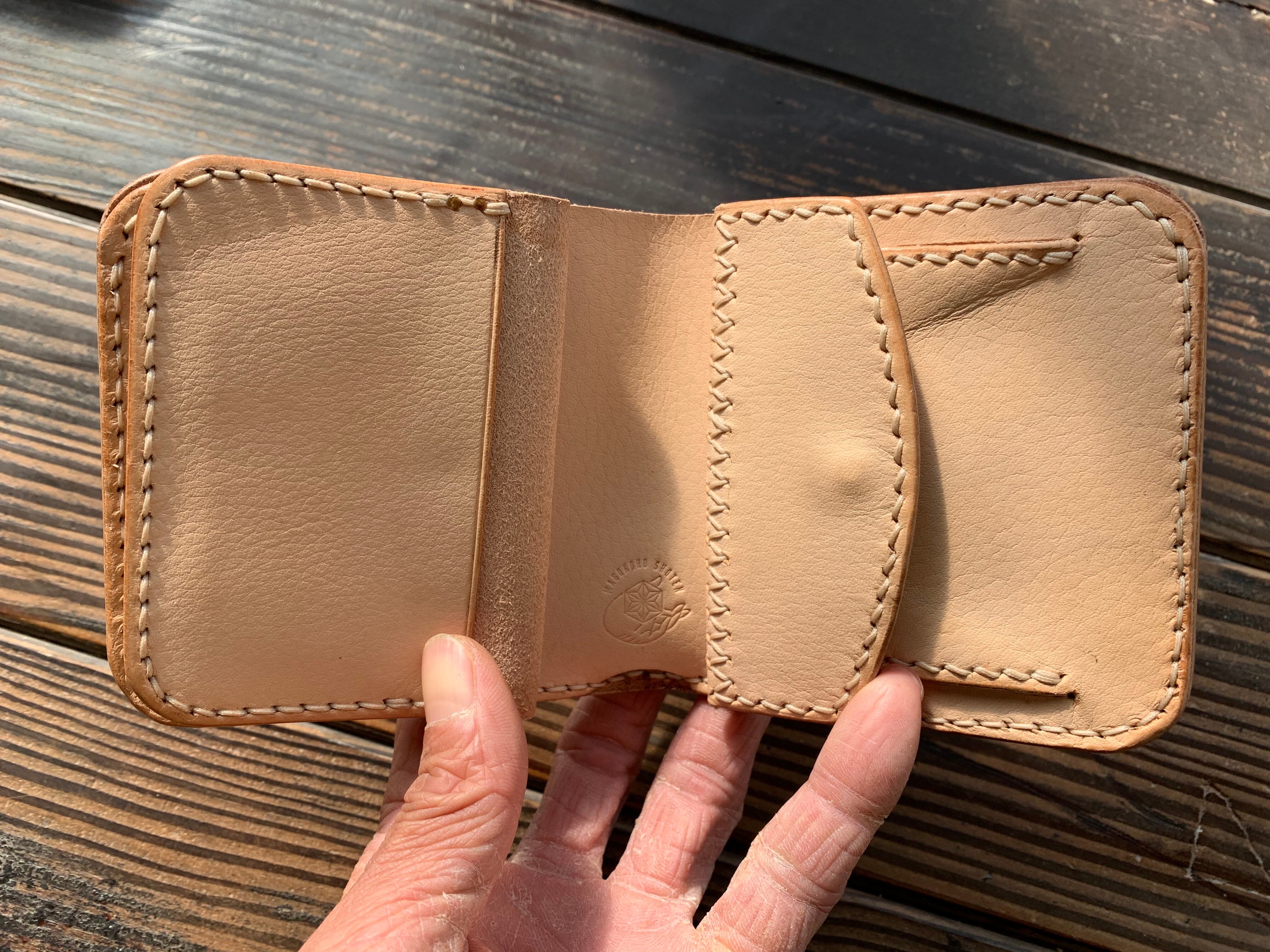 主に牛のヌメ革を使用し、財布側面にはスキモレザーを使用しています。