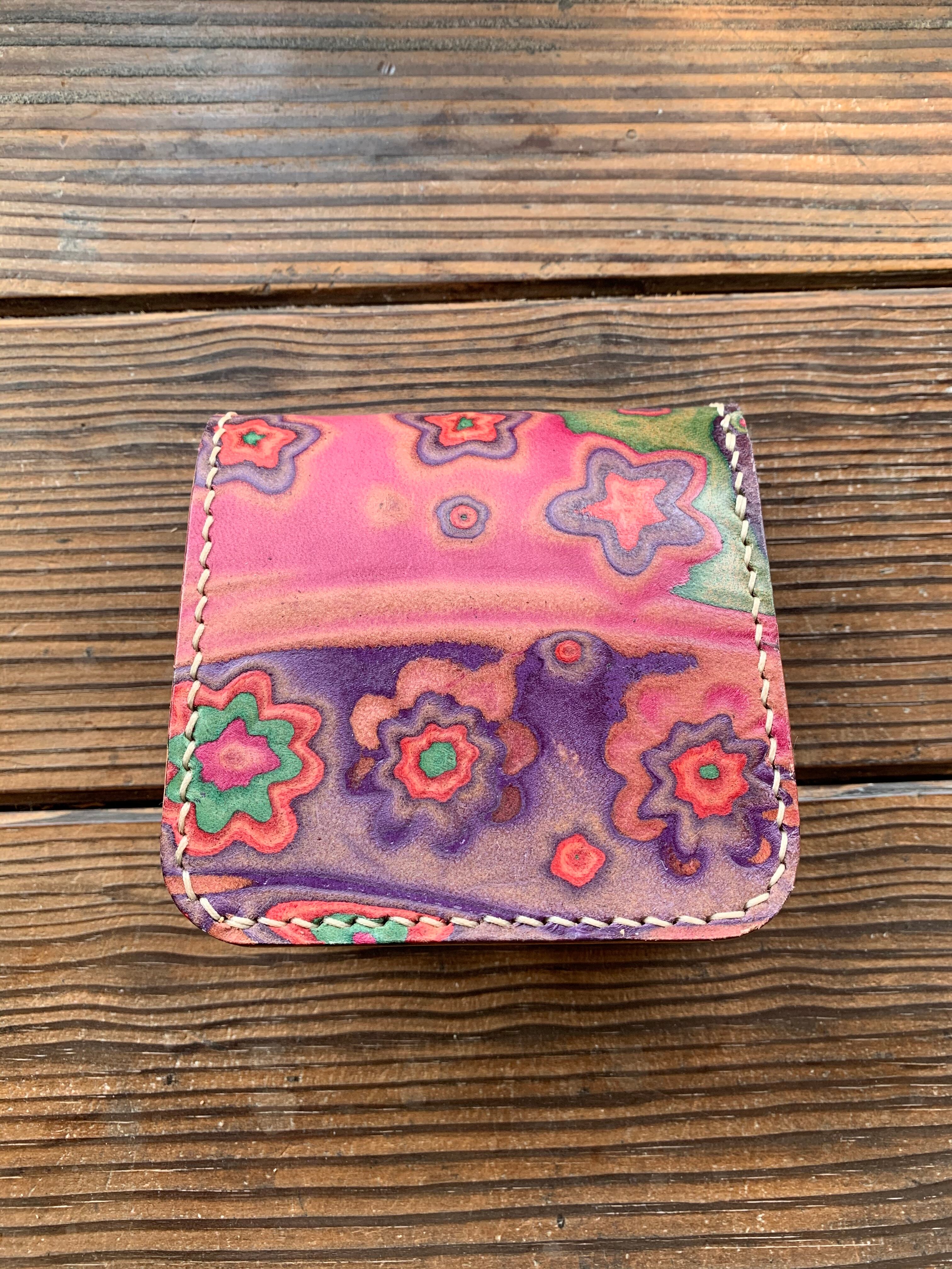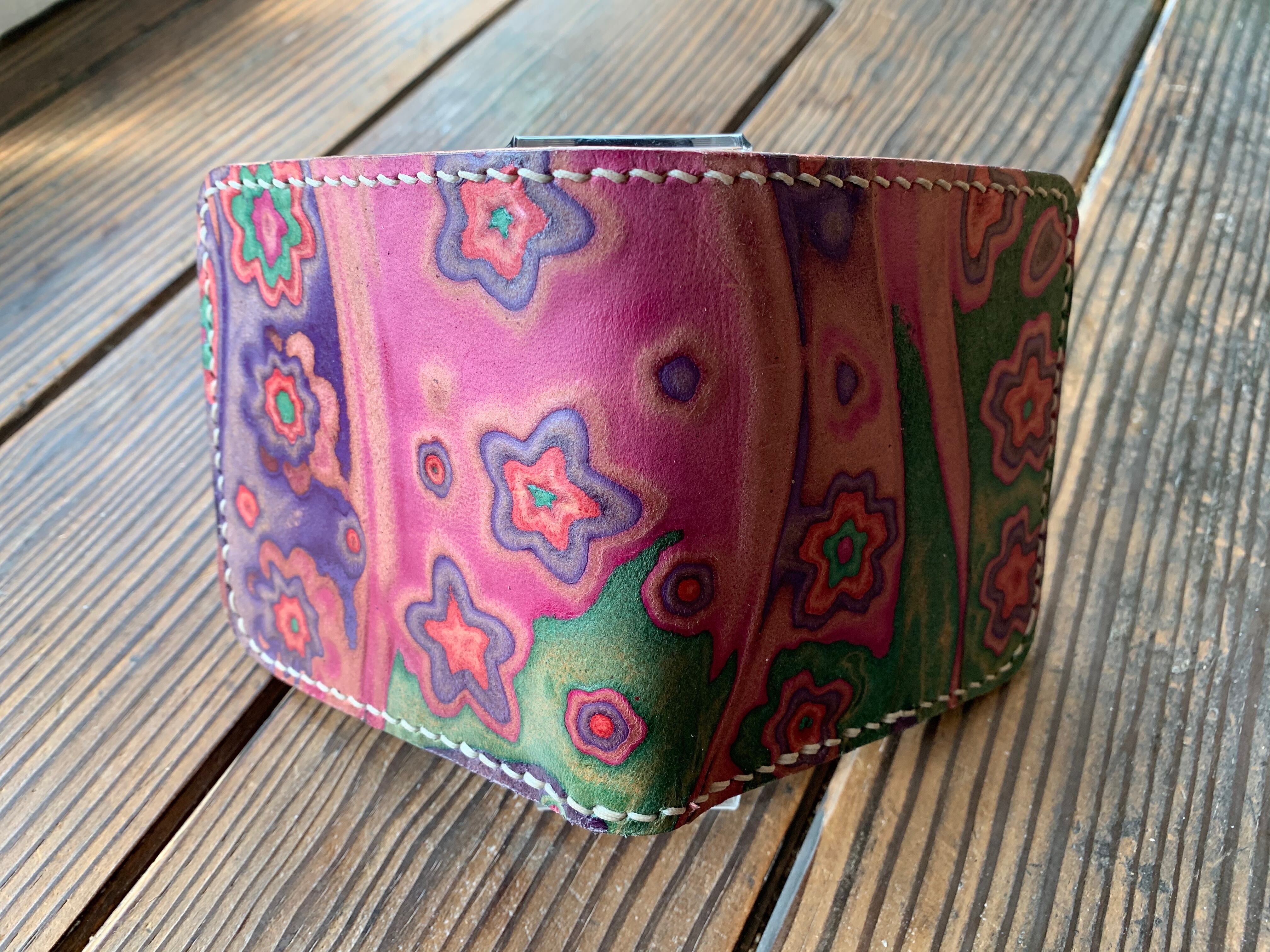 スキモレザーとは、様々な色の革を幾重にも貼り重ね、特殊な技術で薄く漉くことで世界にひとつだけの断面模様が現れる革です。