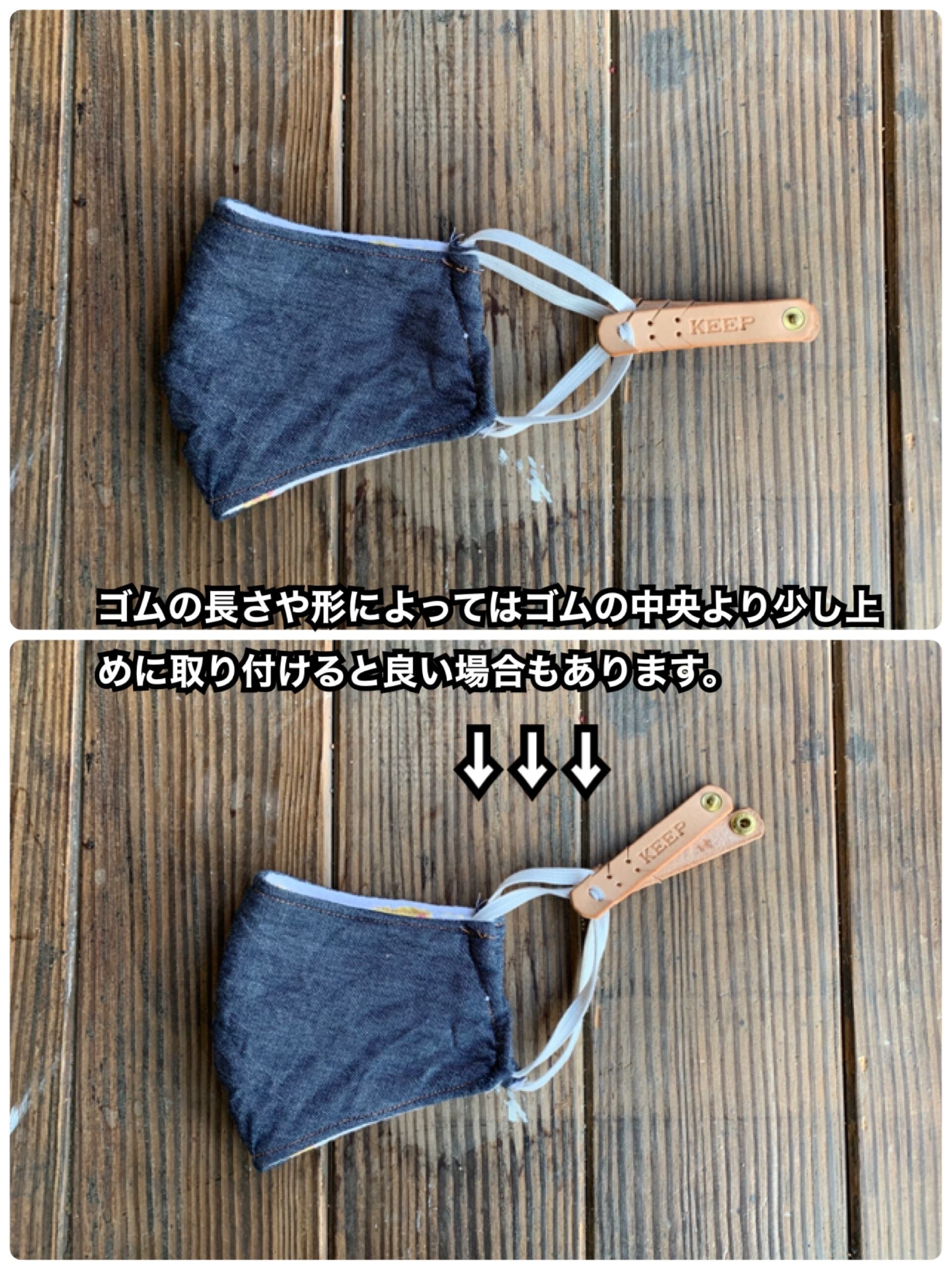 ※ご使用になるマスクや頭の形によっては、バンドをマスクゴムの中心で取り付けるのではなく、写真6枚目の様にゴムの中心よりやや上に取り付けるとフィットしやすいこともあります。