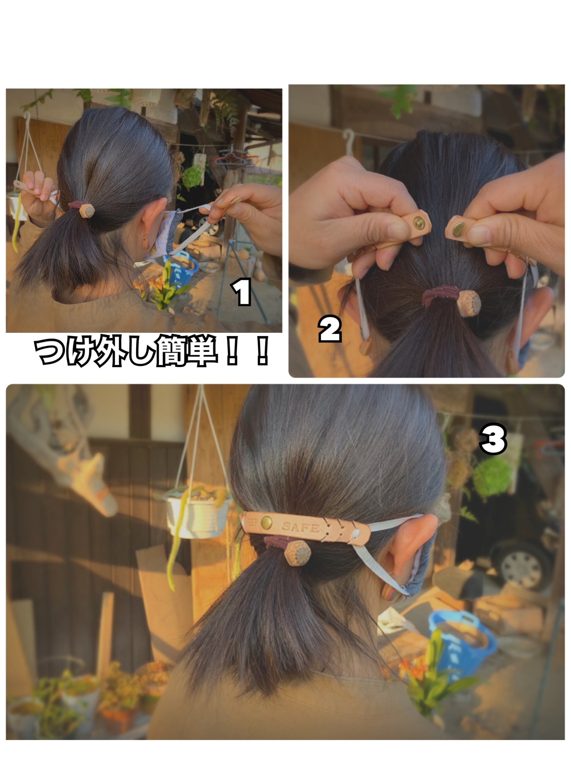 バンド自体がボタンで2つに分かれるようになっているのでゴムにバンドを引っ掛けたら、後はいつも通りにマスクを着ける感覚で後ろでボタンをパチっと留めるだけです‼︎