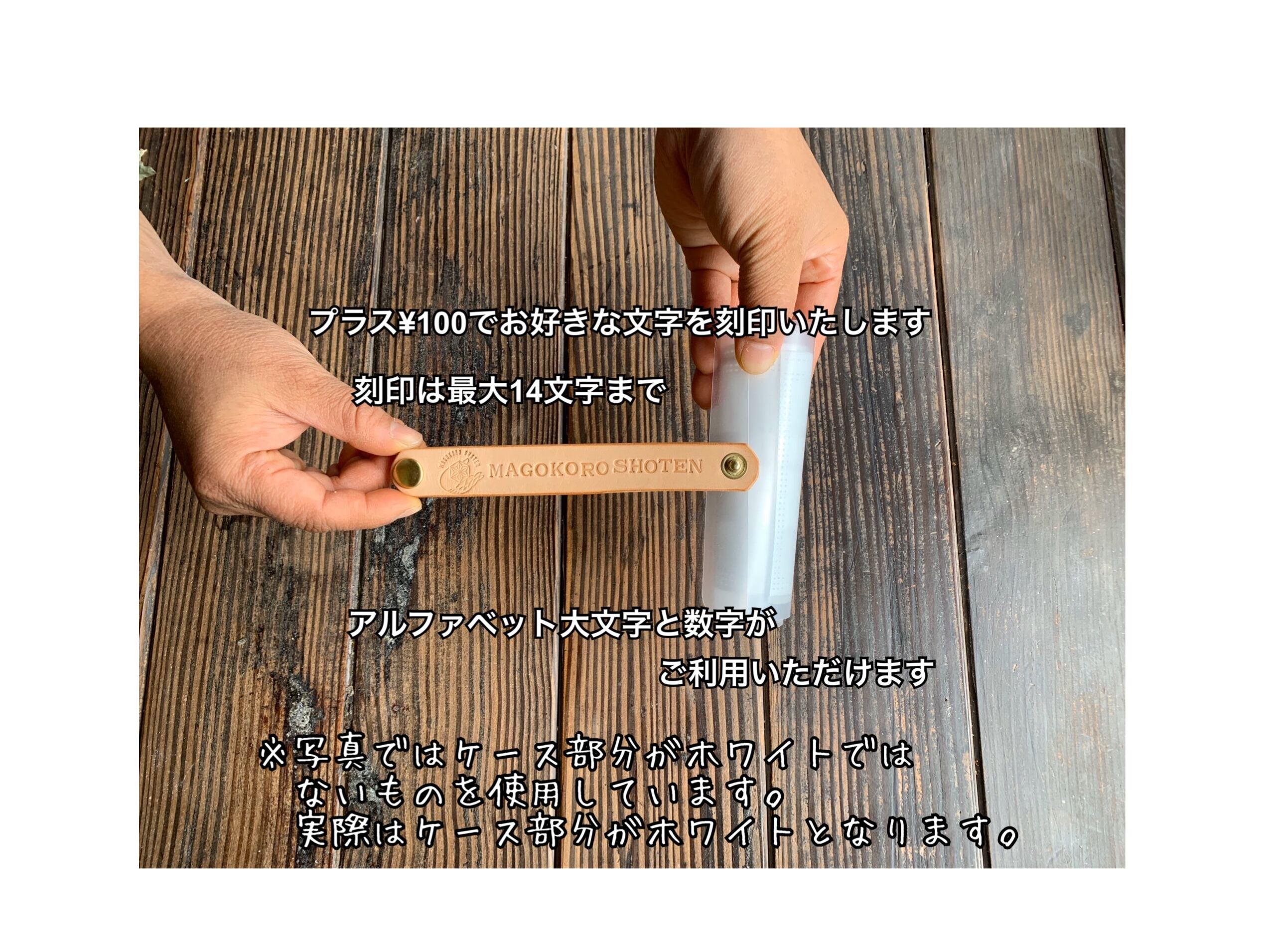 プラス¥100で革のベルト部分にお好きな文字を刻印することができます。