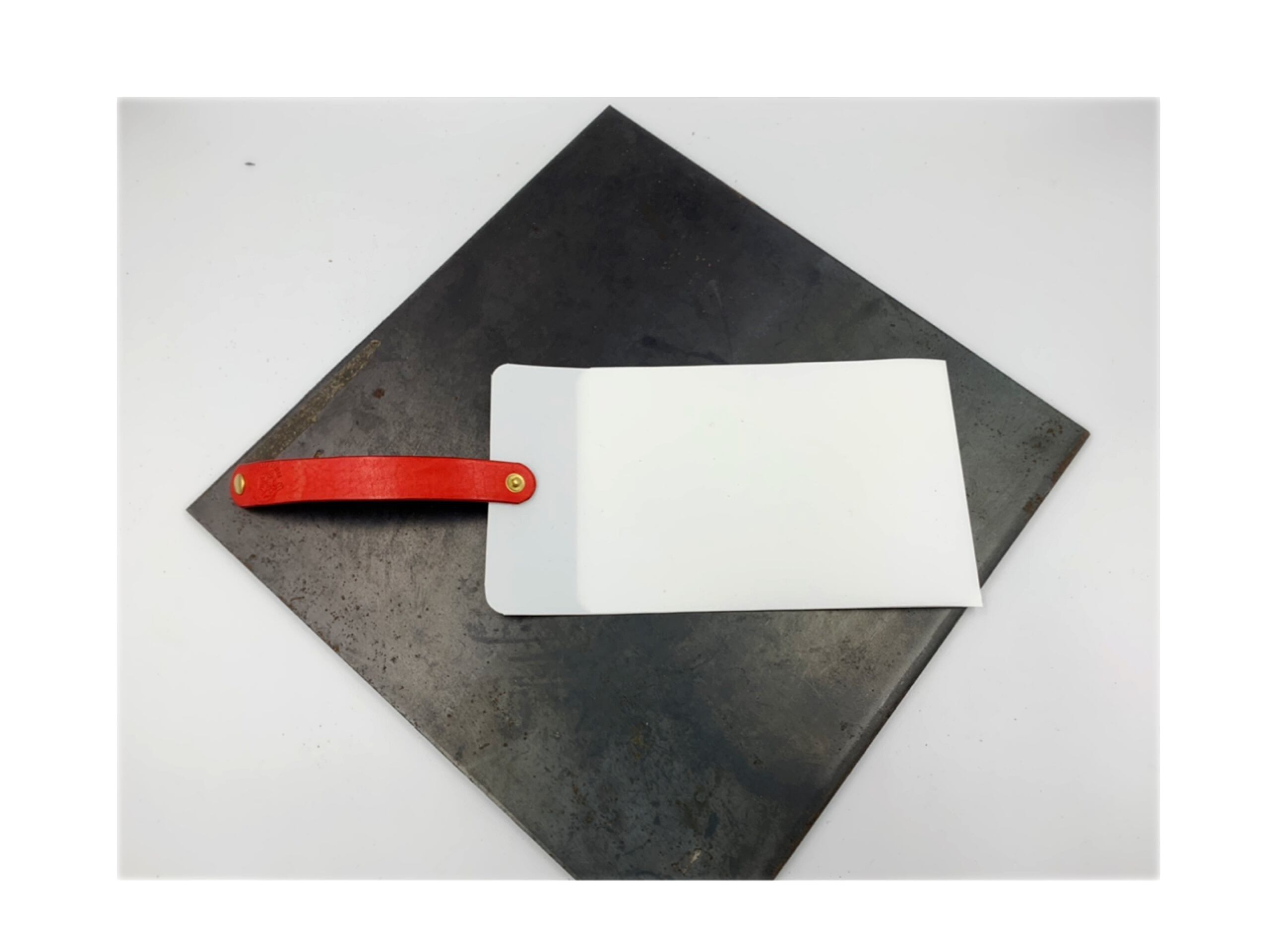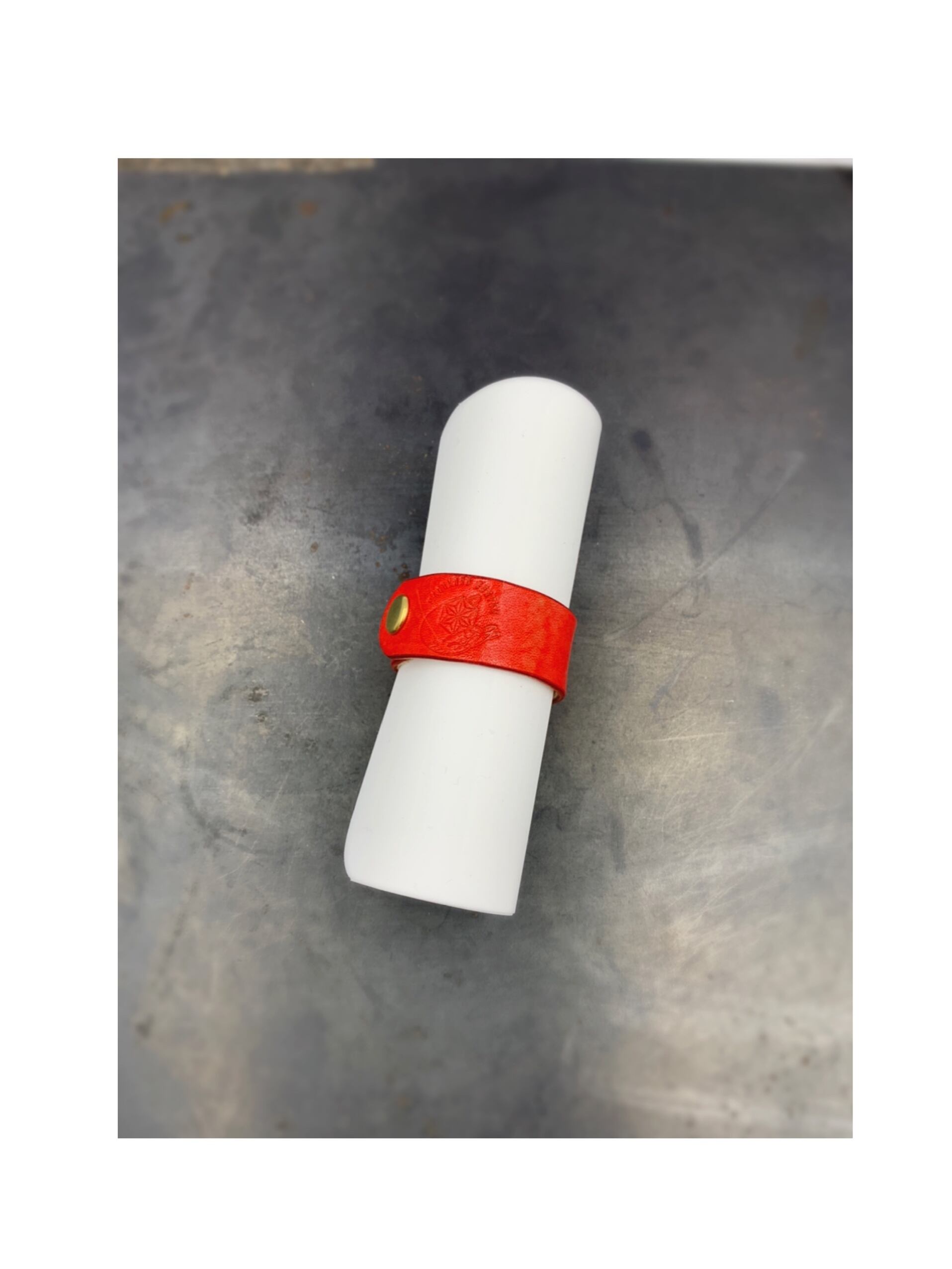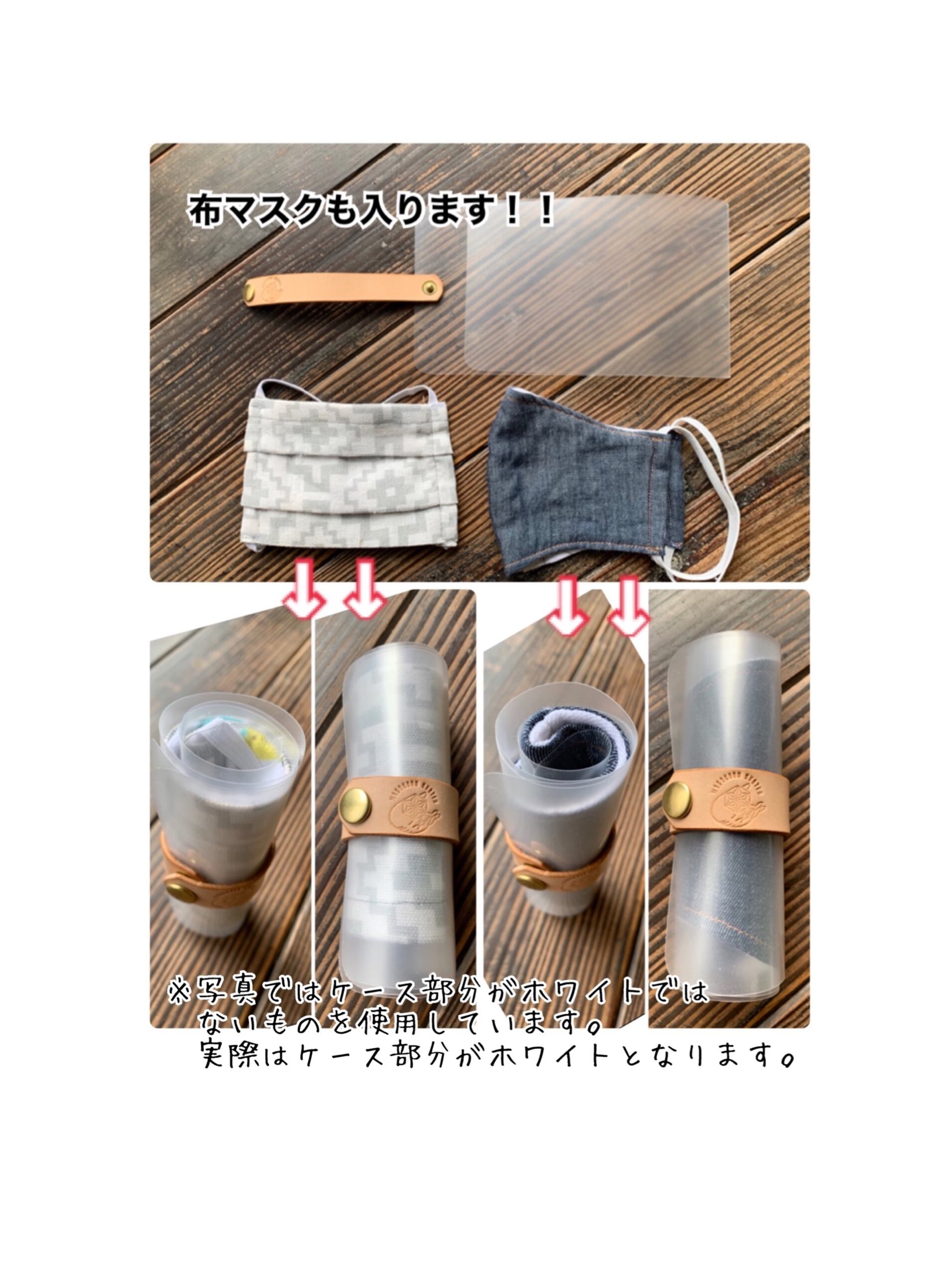 ケースにマスクを挟み込んだら、クルクルと巻き、革のベルトで留めていただくタイプです。
