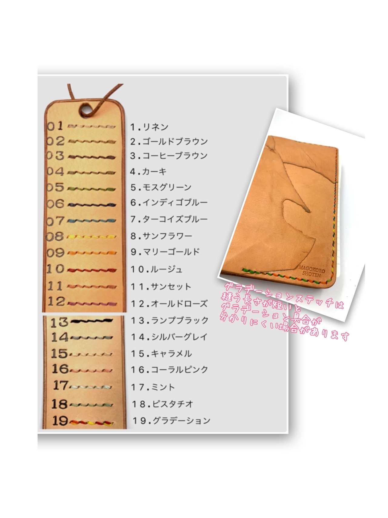 ステッチカラーは下記の19色から無料でお選びいただけますので、必ずお好きなステッチカラーをご選択ください。(ステッチカラーの見本は写真10枚目をご覧ください)