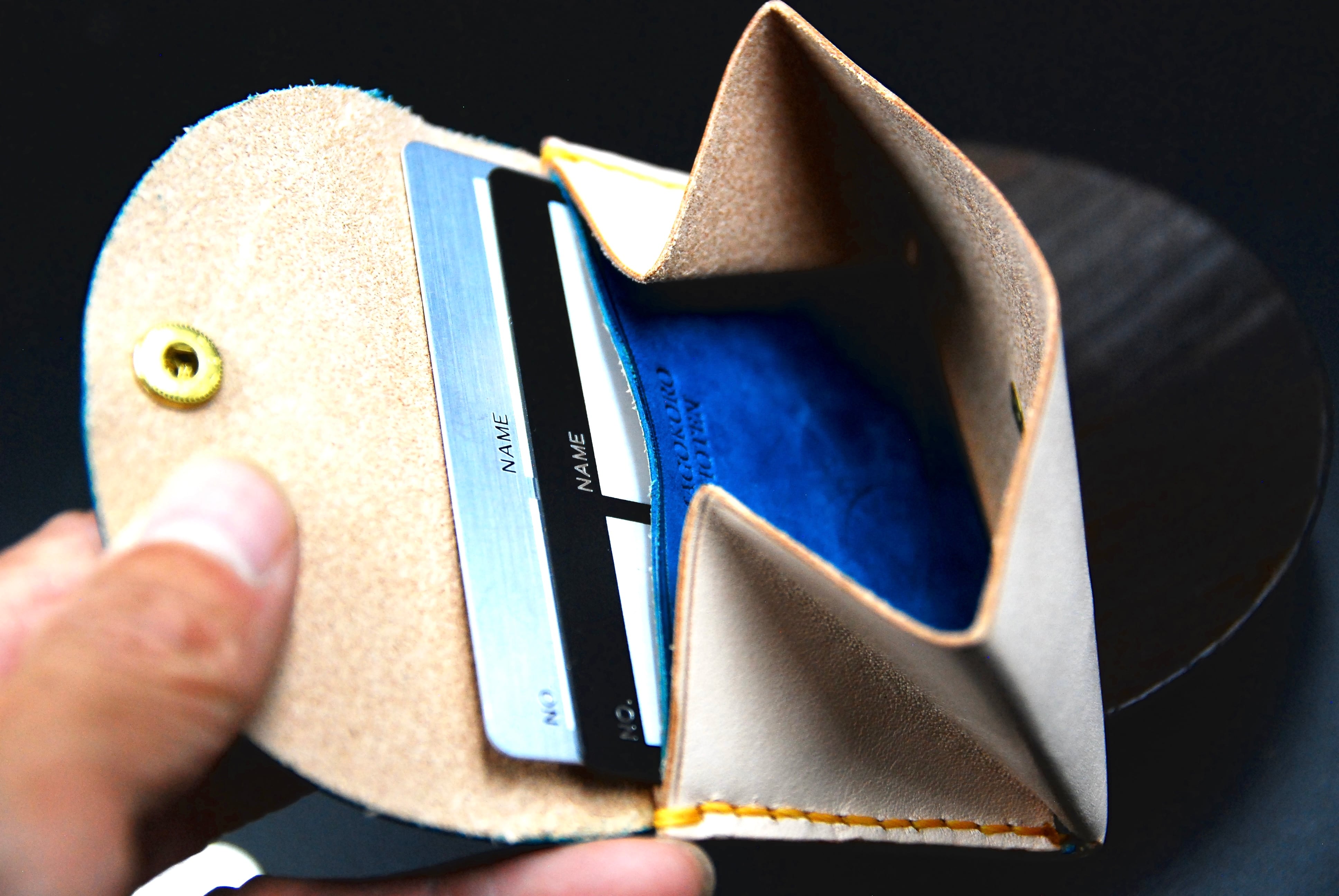 蓋とカード入れの仕切り部分の革の色を、写真9枚目の11色からお選びいただけます。