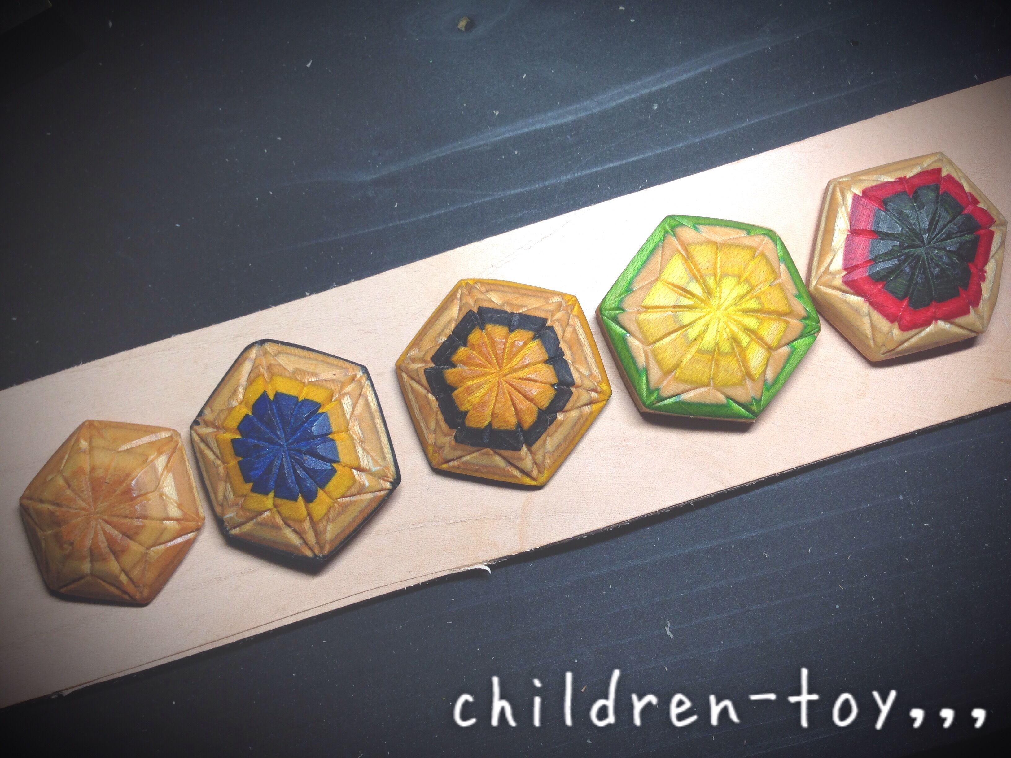 写真左からナチュラル、青黄、黄黒、黄緑、緑赤です。